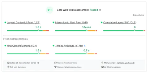 Finally, we addressed a major interaction bottleneck identified via Vercel’s Speed Insights. The cookie notice was responsible for poor INP scores, so we replaced it with a more performant solution using UserCentrics, bringing the INP down from 260ms to 80ms.