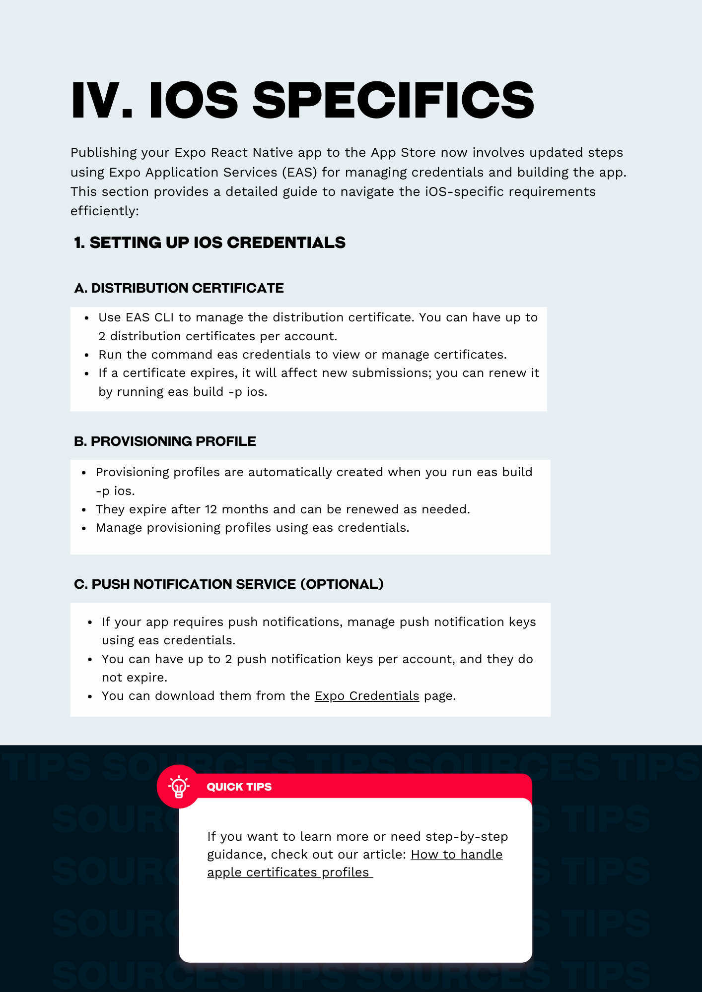 Platform-Specific Insights: Ensure your app meets all iOS and Android requirements, with guidance on provisioning profiles, certificates, and keystores.